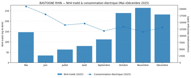 Ces taux de réduction peuvent varier d’un jour à l’autre et d’un mois à l’autre : ils dépendent principalement des charges ammoniacales entrantes à traiter, qui fluctuent naturellement.