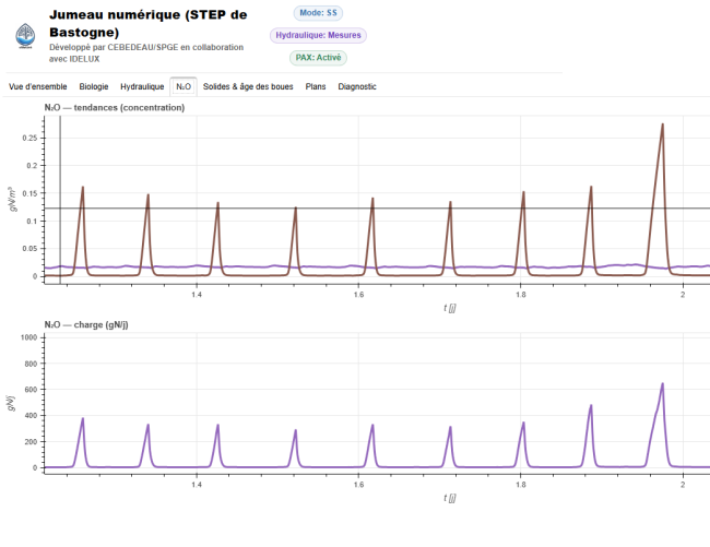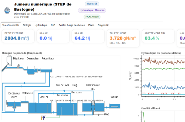 Une innovation récente majeure est la mise en place d’un jumeau numérique complet de la station, basé sur un modèle mécaniste de boues activées (famille ASM) enrichi pour estimer le N₂O. Il reproduit le fonctionnement physique et biologique (alternance zones anoxiques/aérobies, phases aération/anoxie), se calibre sur les données site et permet de tester hors site des stratégies d’exploitation avant application réelle.