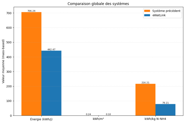 En juillet 2025, le système intelligent eWatLink a réduit la consommation d’énergie quotidienne moyenne de 35 % et 37 % respectivement par rapport à mai 2025 et juin 2025, périodes exploitées avec l’ancien système. Une part de ces gains provient de l’évitement des pics de consommation liés au fonctionnement à pleine charge des soufflantes d’aération.
