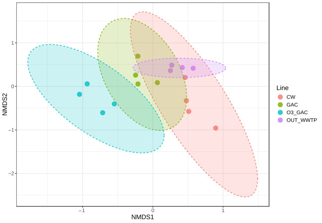 Il a également été observé que les communautés bactériennes retrouvées en sortie de station d’épuration, et dans le FPV ne présentaient pas de différence significative (p = 0,063), ce qui correspond aux études précédentes, dans lesquelles il a été rapporté que les communautés décrites dans les FPV sont dominées par les mêmes phyla que ceux trouvés dans les effluents. En revanche, les communautés du CAG et de l'O3 + CAG différaient significativement de celles de la station d'épuration OUT (p = 0,036 et p = 0,029, respectivement). Le traitement O3 + CAG a induit un changement distinct et significatif dans la communauté microbienne par rapport au CAG (p = 0,028), comme rédigé dans la littérature scientifique.