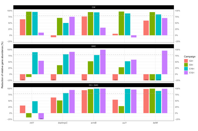 Les taux d'élimination des ARG et de l’intégrase de classe 1 ont été calculés afin d'évaluer la capacité de la station d'épuration à les éliminer. Pour les quatre ARG analysés (blaAmpC, ermB, sul1 et tetW), les efficacités d'élimination variaient de 35,17 % (blaAmpC) à 97,82 % (ermB). La station d'épuration a permis de réduire de plus de 80 % le gène ermB au cours des deux campagnes. En revanche, la concentration en intI1 a augmenté (313,99 %) au cours de la deuxième campagne, ce qui indique une prévalence plus élevée des transferts de gènes en sortie de la station d’épuration par rapport à l’entrée. En général, dans cette étude, les traitements quaternaires ont réduit les quantités d'ARG (blaAmpC, ermB, sul1 et tetW) et d'intI1 plus efficacement que la station d'épuration seule. L’ajout du filtre planté permet une élimination adéquate et fiable de tous les ARG et intI1, avec une faible variabilité temporelle par rapport à O3 + CAG et CAG. Seuls des effets mineurs de libération d'ARG ont été observés dans FPV. Bien que O3 + CAG ait atteint une élimination moyenne similaire à celle de FPV, son incapacité à éliminer intI1 a souligné l'avantage de FPV.